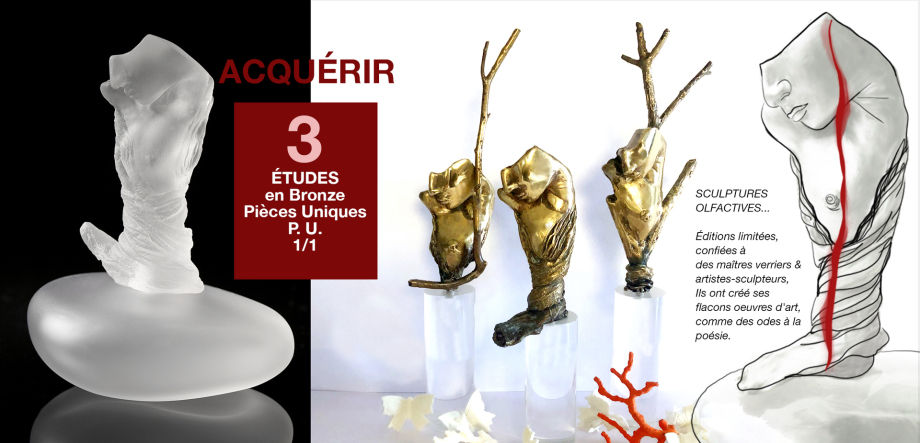 Une néo-parfumerie belle comme un rêve, des eaux poétiques, oniriques et mystérieuses (J’ai fait un rêve, Fusion Sacrée, Mon nom est rouge) nichées dans des sculptures d’exception sensuelles et précieuses.